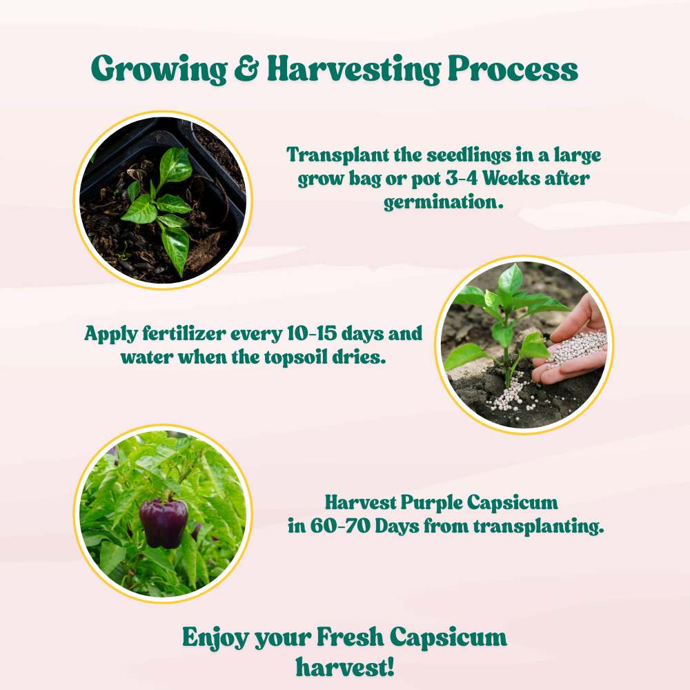 Purple Capsicum, also known as Shimla Mirch, is a colorful and nutritious variety of sweet pepper. Rich in antioxidants and easy to grow in pots or containers, it adds vibrant flavor to salads, stir-fries, and more.