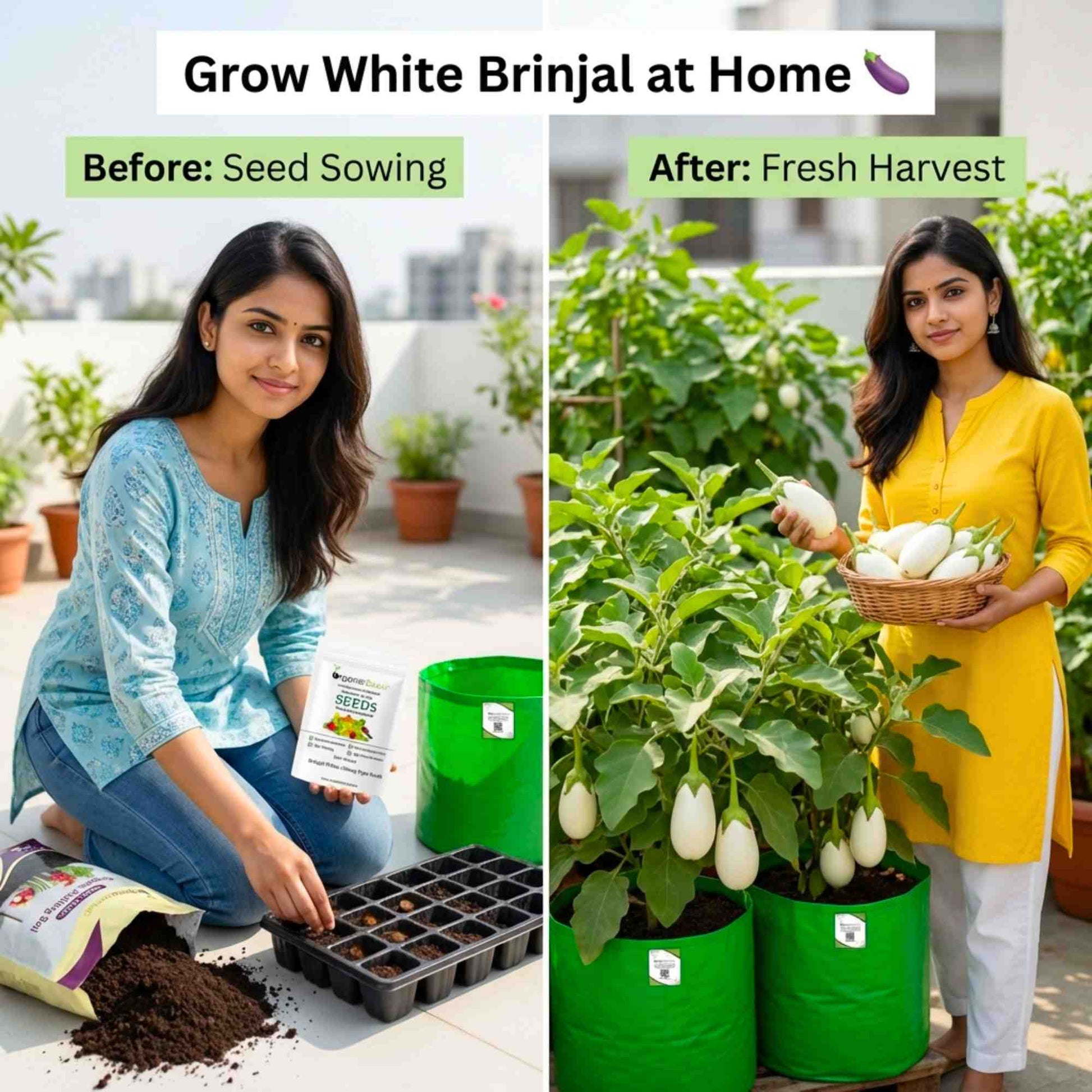 Grow nutritious and delicious white brinjal (eggplant/baingan) easily in your home or terrace garden. This oblong variety of white brinjal is known for its mild flavor, tender texture, and impressive yield. Perfect for small-space gardening!