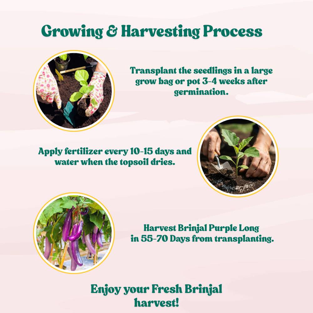 Long Purple Brinjal is a heat-loving vegetable. It is typically grown by transplanting seedlings rather than direct sowing into grow bags or containers. Brinjal seeds germinate best in a temperature range of 18-32°C.
