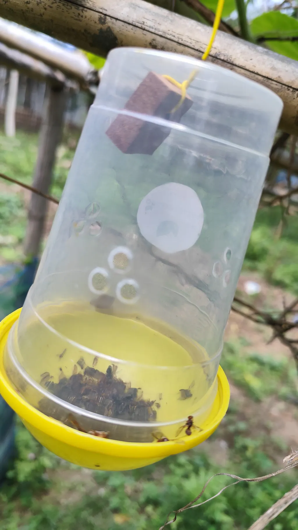 - Hang the lure under the trap and suspend the trap from a tree branch or suitable support.