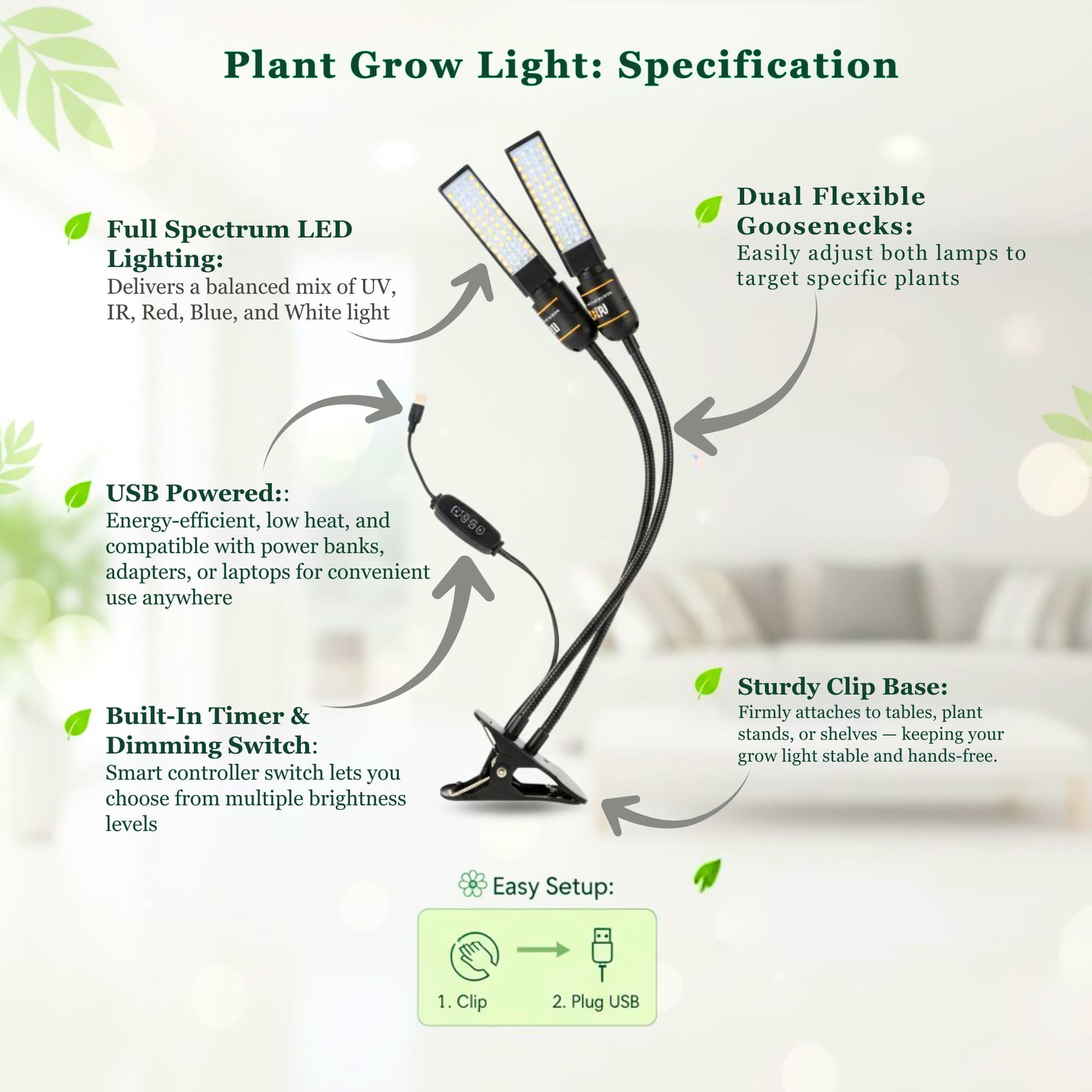 Grow Light with Full Spectrum LED for Indoor Plants — Dual Head with Adjustable Gooseneck & Smart controller switch
