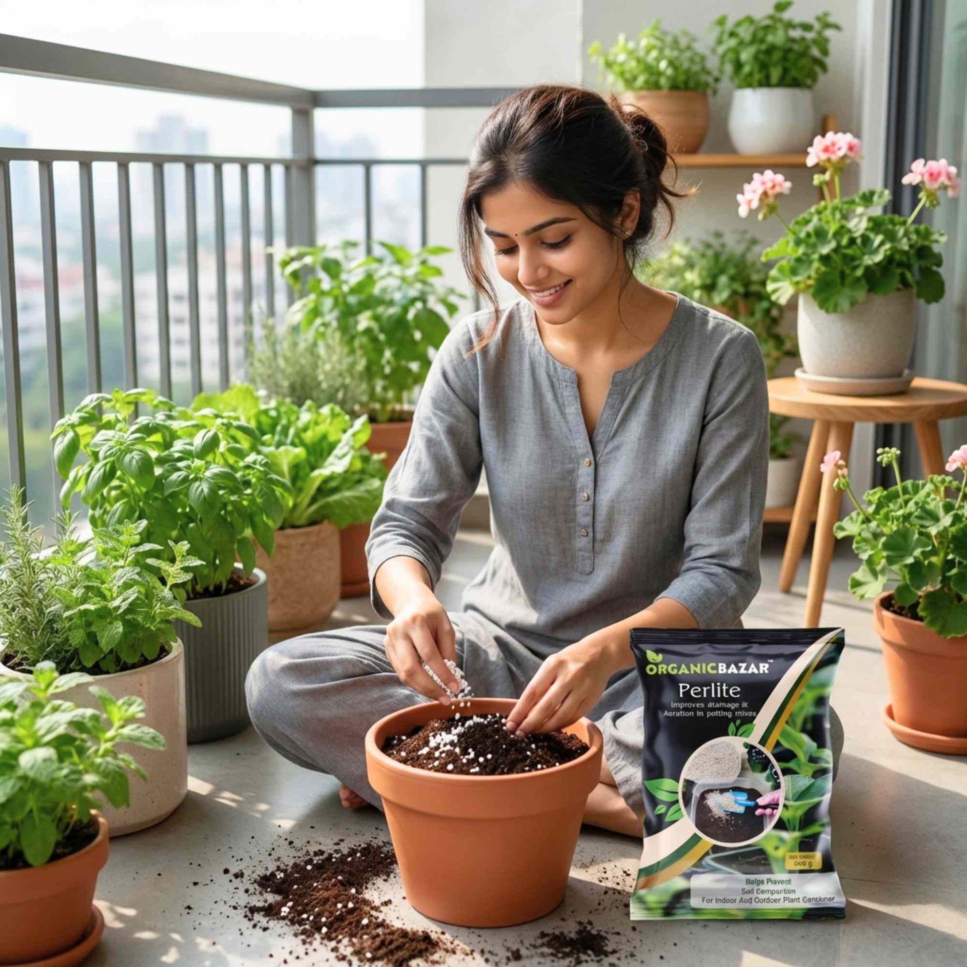 A premium mix of one part perlite, 1 part peat moss or cocopeat, and one part vermiculite is optimum for container growing, enabling the pot to hold just enough water and oxygen.
