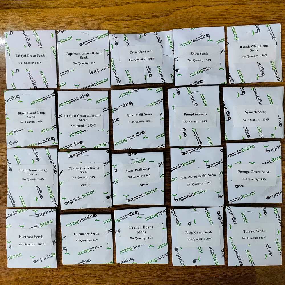 - 20 types of seasonal vegetable seeds (e.g., Bottle Gourd, Ridge Gourd, Brinjal, Okra, Spinach, Chilli, Tomato, Sponge Gourd, and more)
